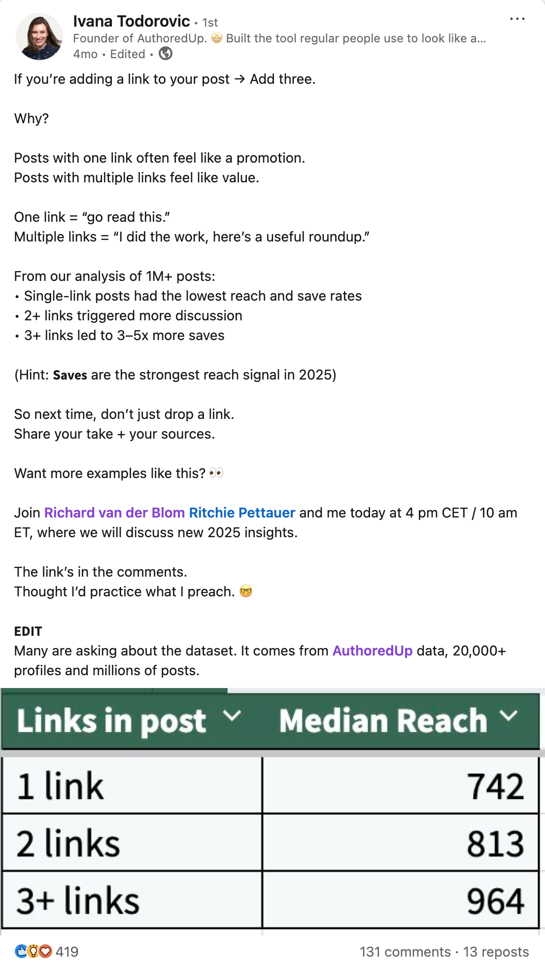 One link looks like a promotion, while multiple links signal value. So readers are more likely to save and engage with those posts.