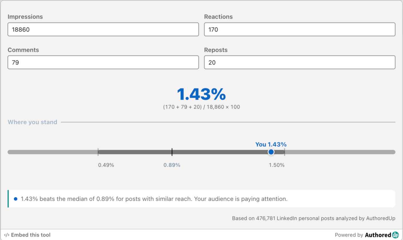 Enter your post stats and see your LinkedIn engagement rate, plus how it compares to real benchmarks.